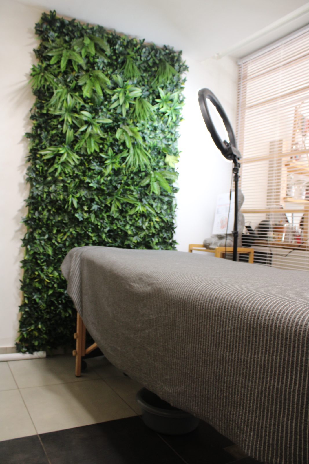 Dès l’entrée, l’atmosphère invite à la détente. La façade, ornée d’un élégant panneau fleuri, donne le ton : ici, le bien-être est une priorité. Devant la porte, quelques sacs exposés avec soin et une petite table joliment dressée apportent une touche conviviale qui rappelle l’esprit du village. À l’intérieur, le charme opère immédiatement. Bois naturel, lumière douce, objets soigneusement disposés… Tout a été pensé pour créer une ambiance à la fois intimiste et inspirante. L’espace est organisé avec goût, mêlant praticité et esthétisme, offrant un cadre propice à la relaxation et au lâcher-prise.